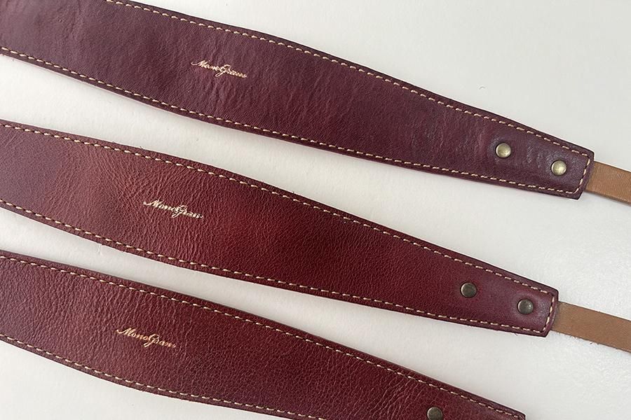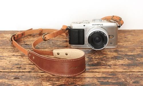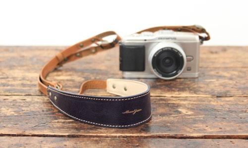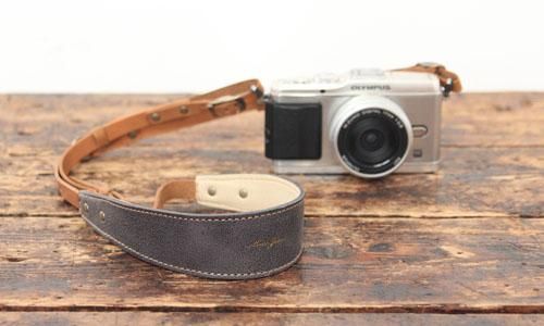 シックな色合いのオイルレザーの肩パッドと、強度のある牛ヌメ革ストラップ部分の"ツートーンカラー”が特徴的なカメラストラップ。