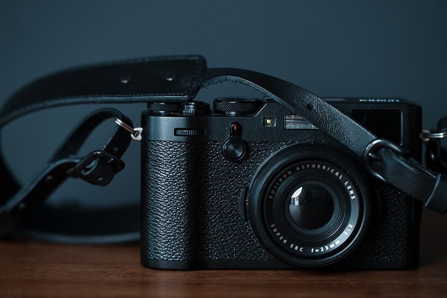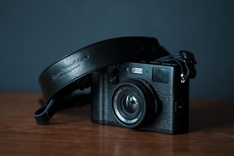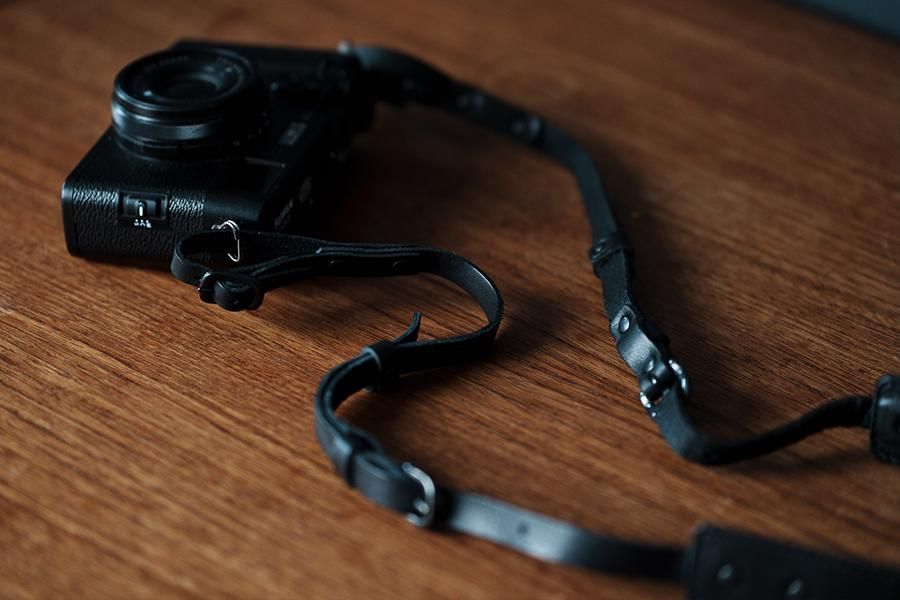 オールブラックで統一された本革カメラストラップ。ミラーレスから一眼レフまで対応するプロ仕様のオイルレザー